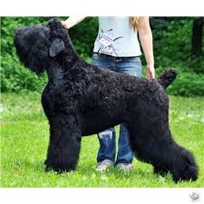 Los ojos son pequeños, ovalados, oscuros y están dispuestos oblicuamente. Las orejas son pequeñas y triangulares, de inserción alta, y cuelgan desde su base. El pelaje del terrier negro ruso es áspero, duro, denso y bien pegado. Puede ser de color negro o negro con pelos grises. Su carácter con los extraños, es un poco agresivo y desconfiado.